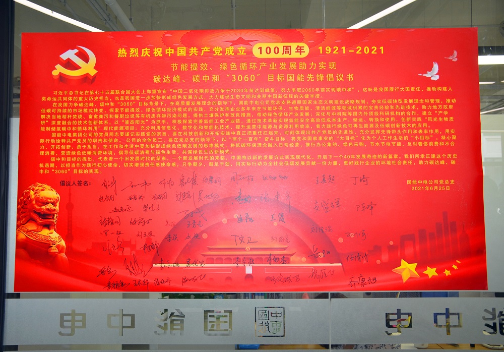 在隨后舉行的“三零六零,國能先鋒”黨員社會責任倡議書聯名簽署活動中,發布了《節能提效、綠色循環產業發展助力實現碳達峰、碳中和“3060”目標國能先鋒倡議書》,由黨員代表趙禎宣讀了倡議書內容,全體黨員積極響應并在倡議書上進行了簽名。